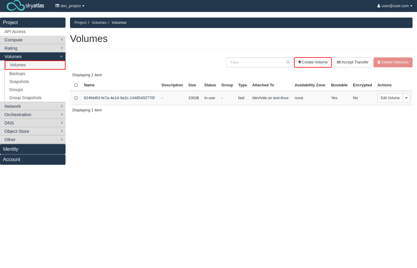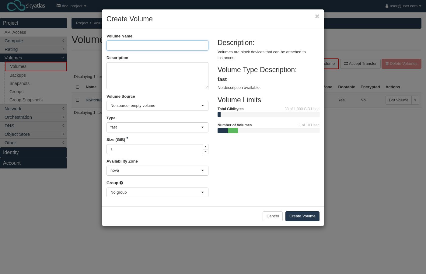 Volume oluşturma işlemine başlamak için "Create Volume" butonuna tıklayın.