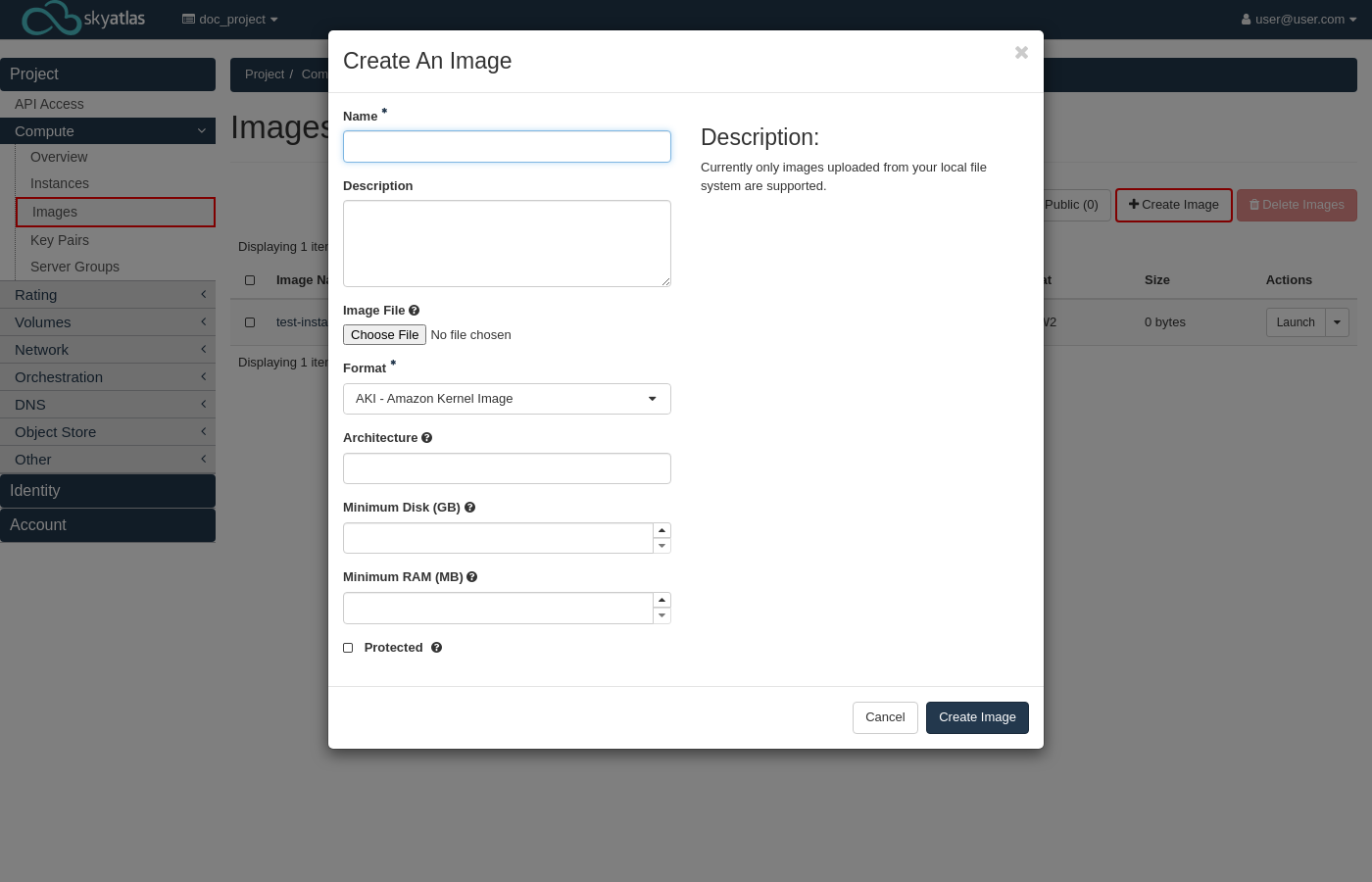 --min-disk ve --min-ram değerleri isteğe bağlıdır ve SkyAtlas Cloud'dan bir imajdan örnek oluşturulurken varsayılan olarak atanacak önceden belirlenmiş değerleri gösterir. Bu değerler oluşturma adımında değiştirilebilir.