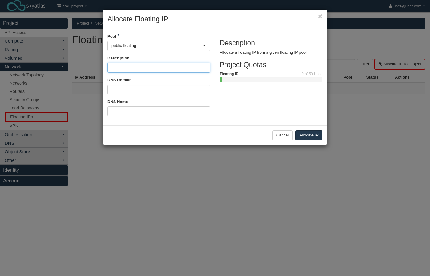 Floating IP'ler sayfasında "Allocate IP" butonuna tıklayın.